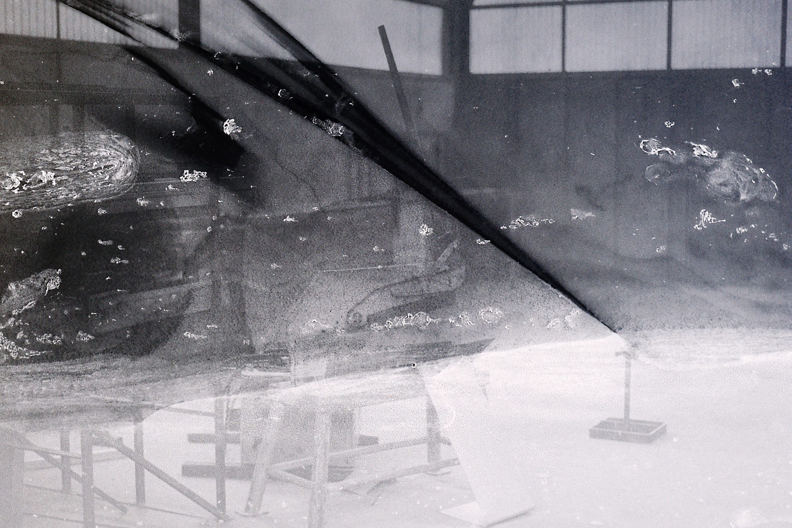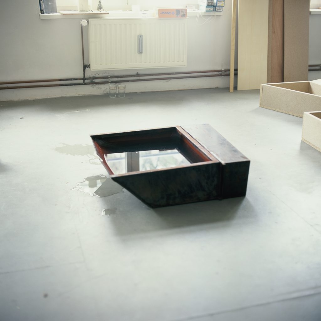Nachbau und Vergrößerung s.u., Spanplatte, Stahlblech, 1985 / Fließgleichgewicht, Stahlblech, Wasser, 1999 / 3 Variationen, Spanplatte, 2001