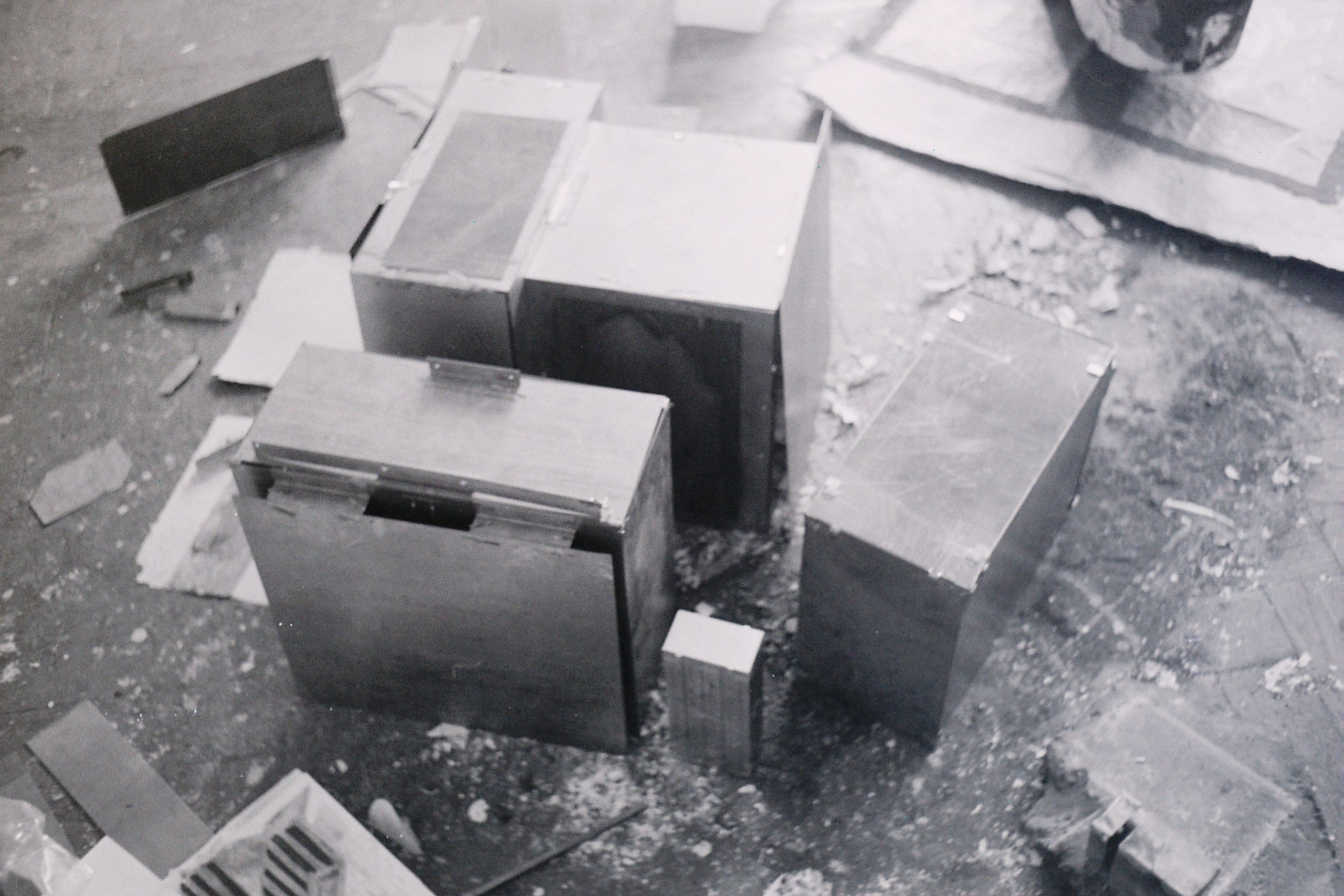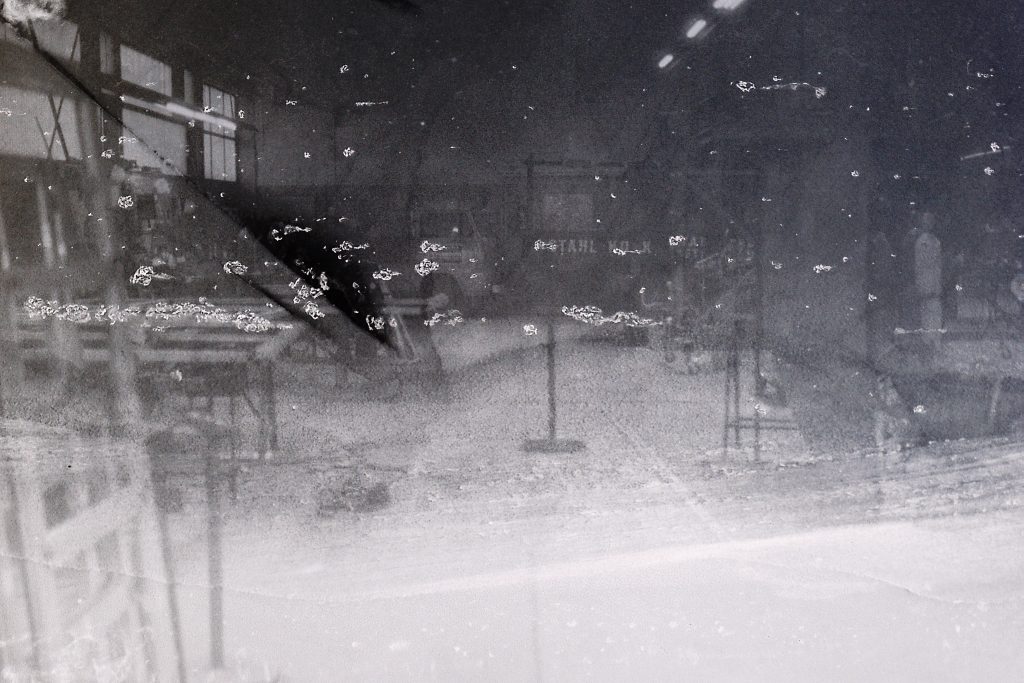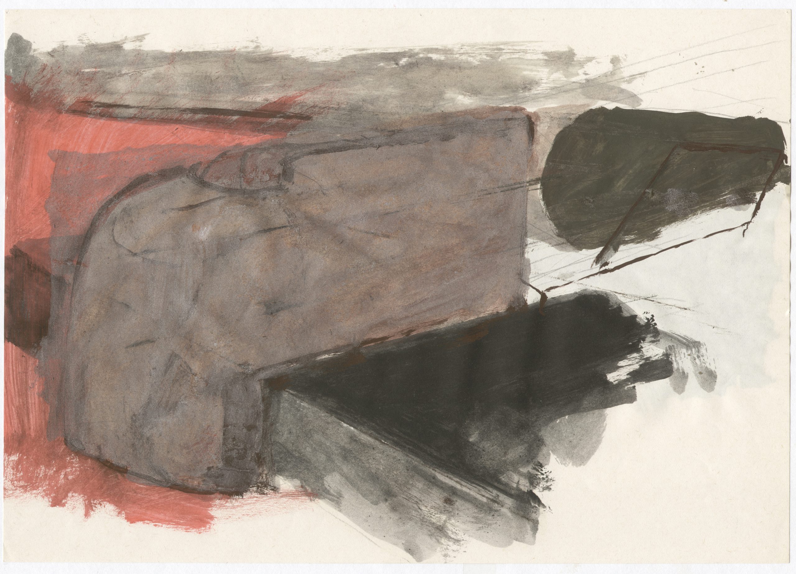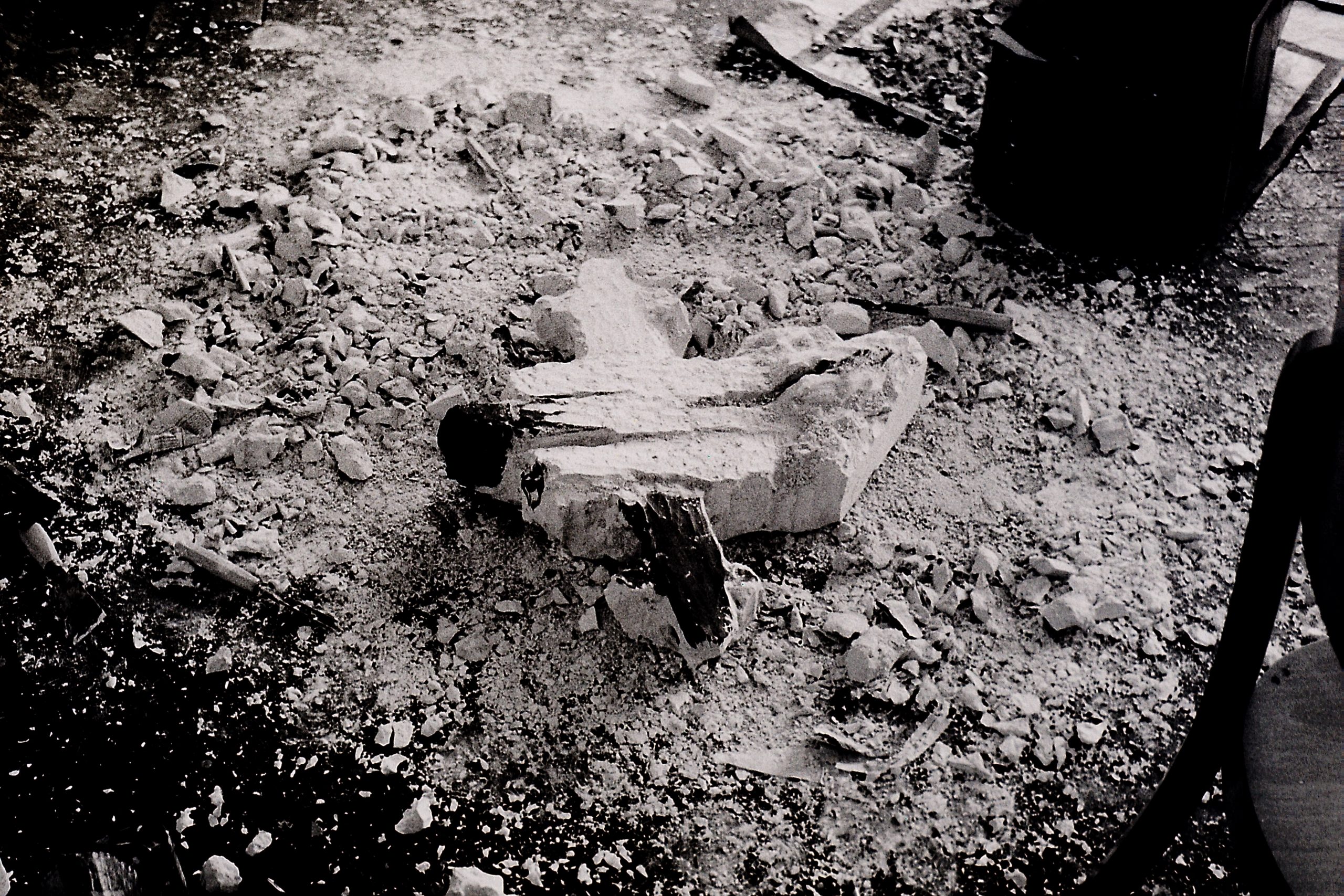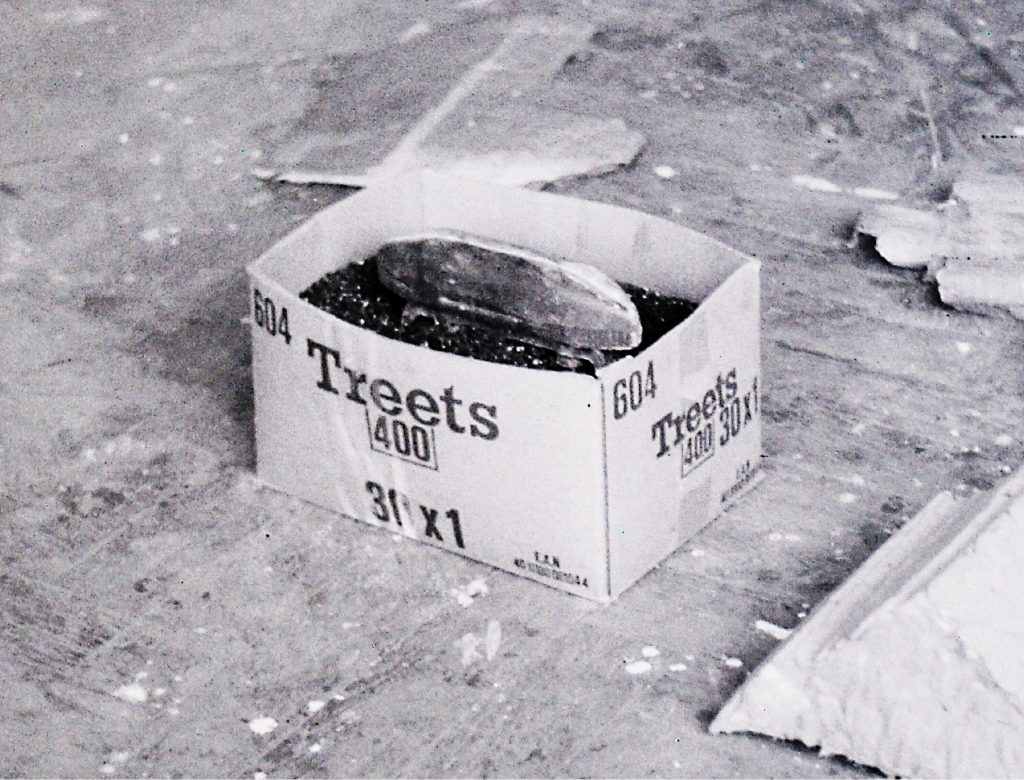 Stahlblock (Fundstück Bahngleis), Pappkarton, Rollsplitt, Abformung in Glasfaserspachtel, Illustration, 1982