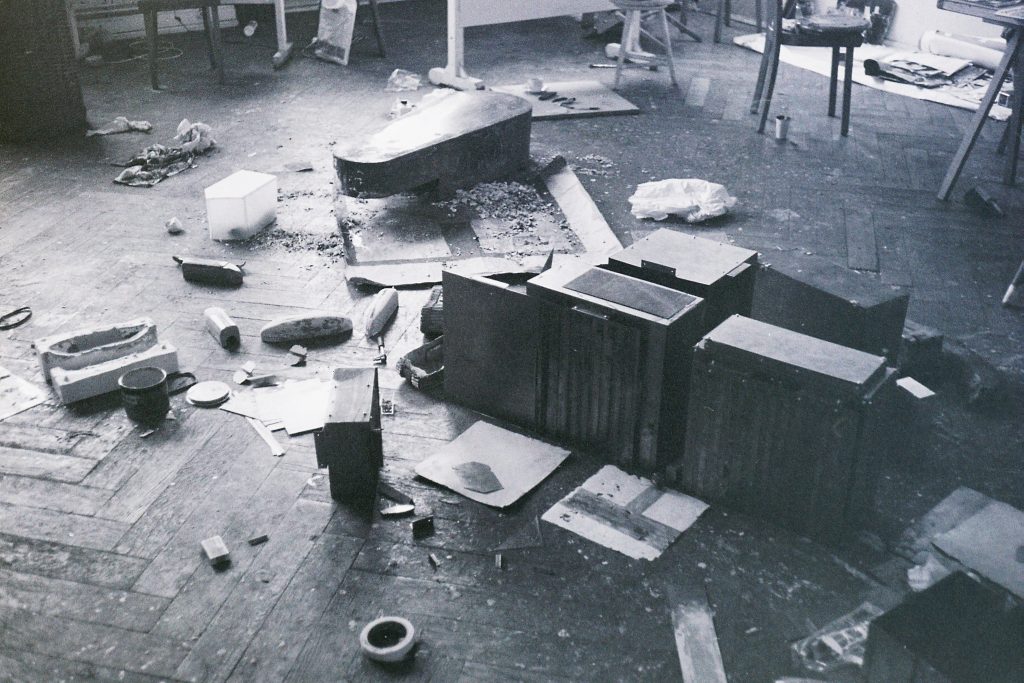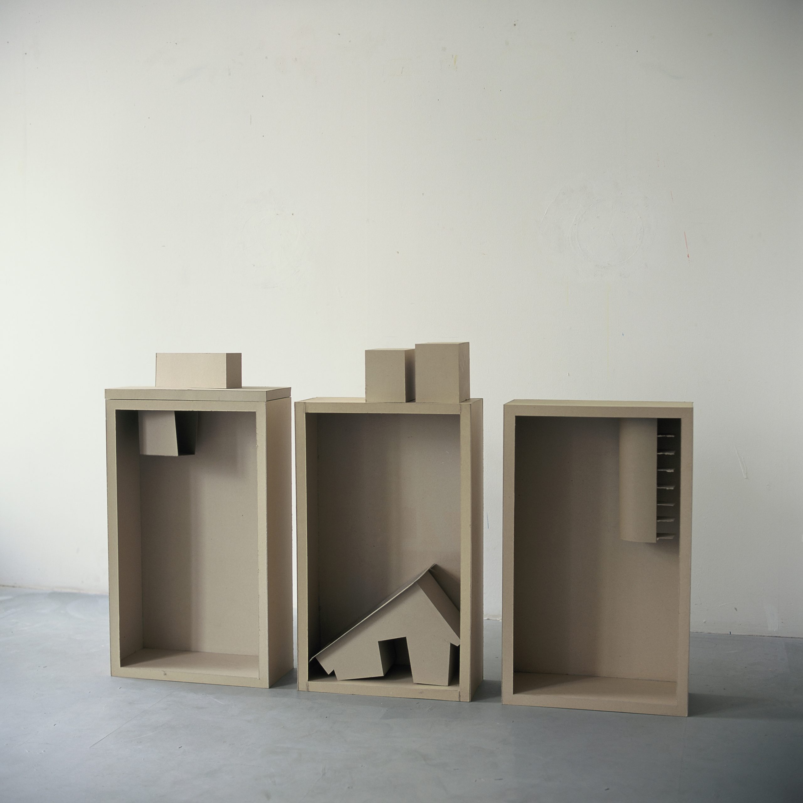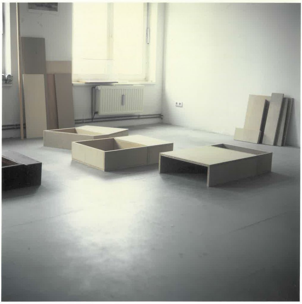 Darüber hinaus basieren die Skulpturen auf Phänomenen des gebauten Raums, etwa auf Lagebeziehungen von Bauelementen oder dem Spannungsverhältnis zwischen Innen- und Außenraum, also der Vorstellung des Darin- oder Davor-Seins.