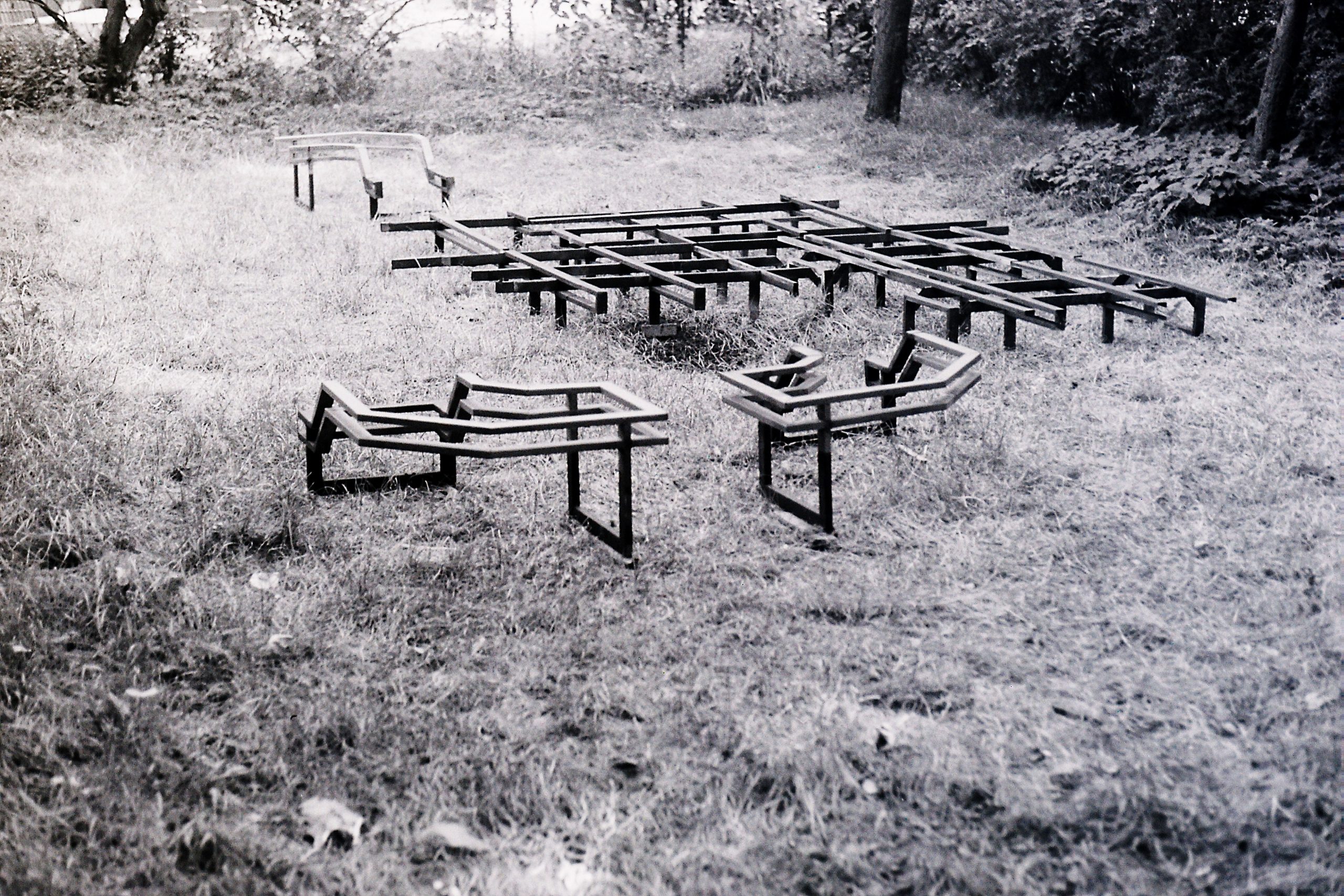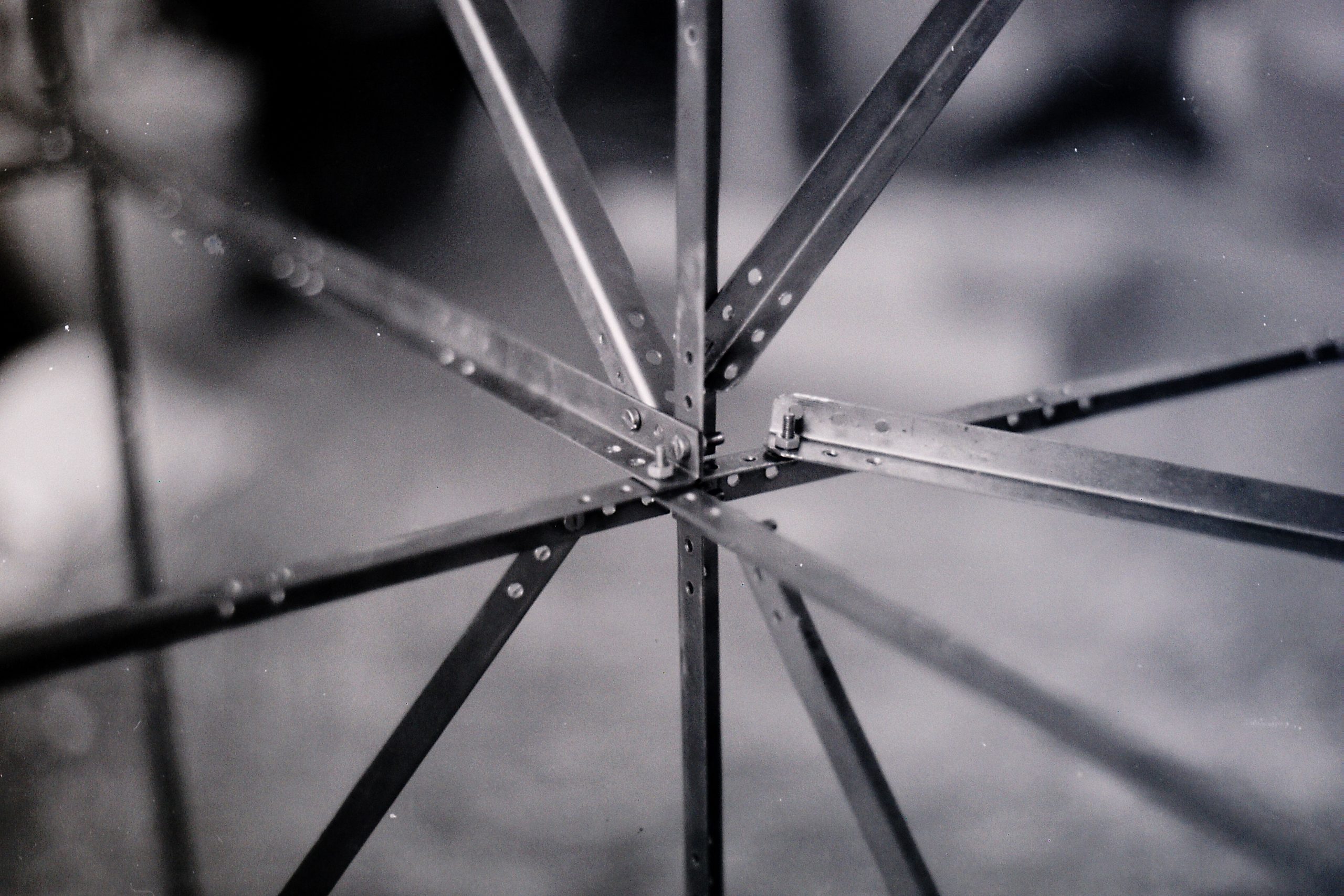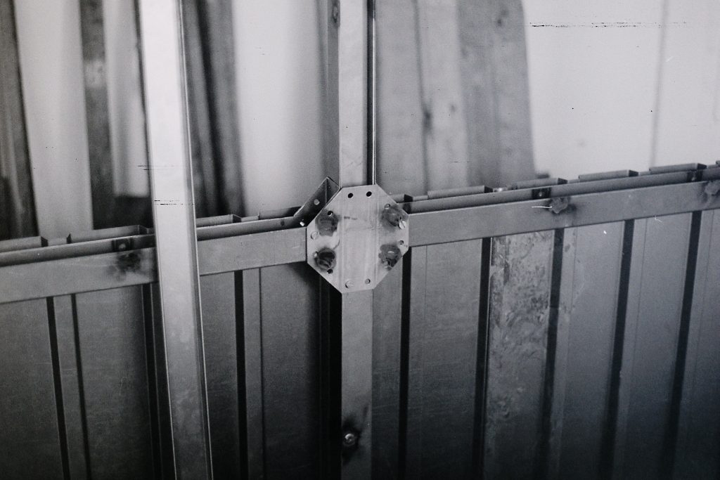 o.T., punktverschweißte Stahlblechprofile, schwarze und graue Metallschutzfarbe