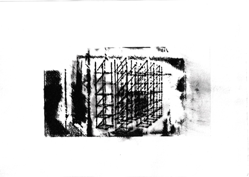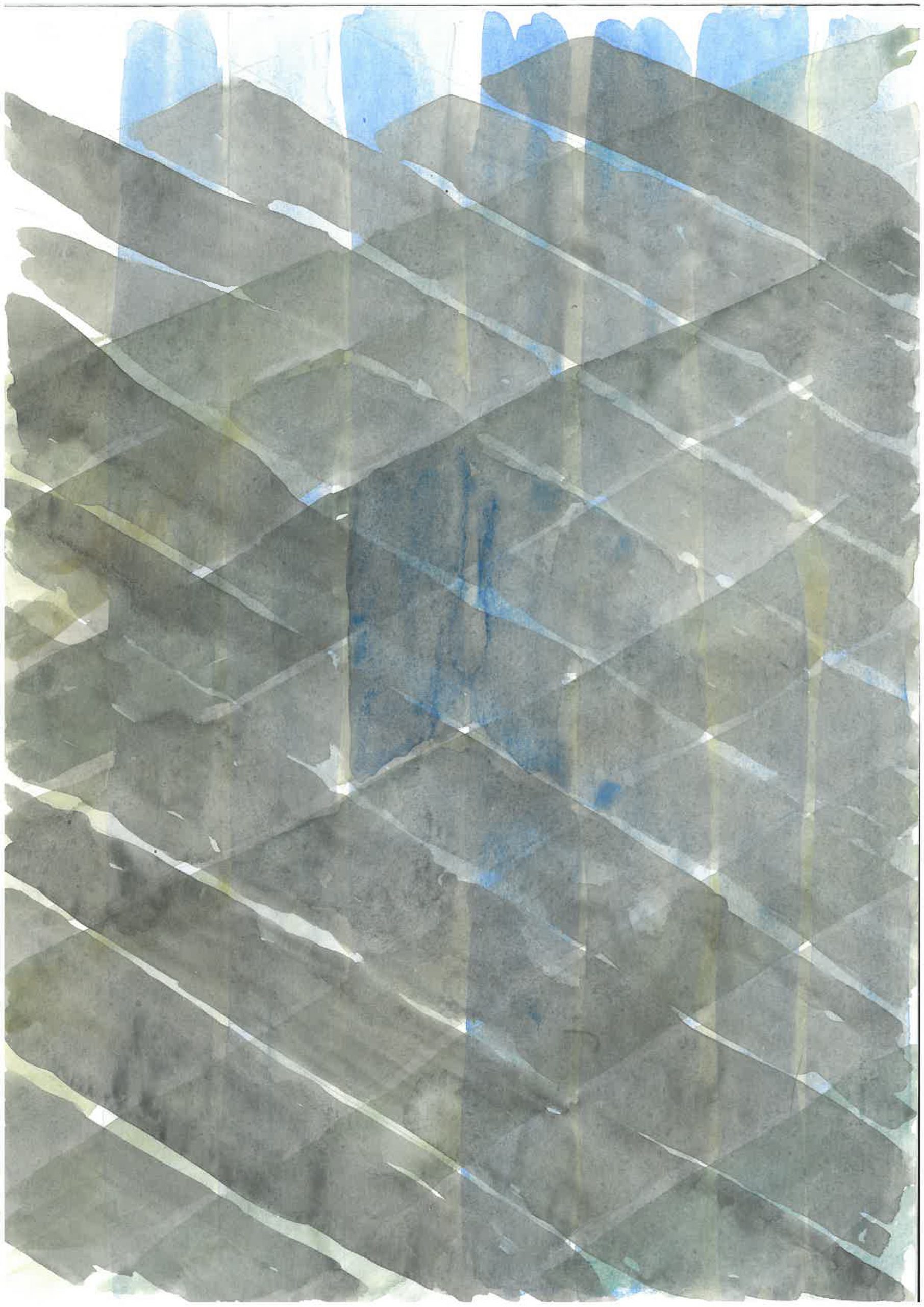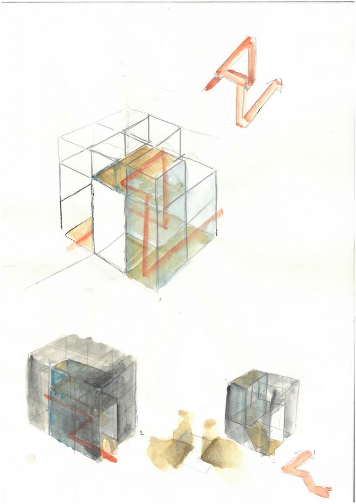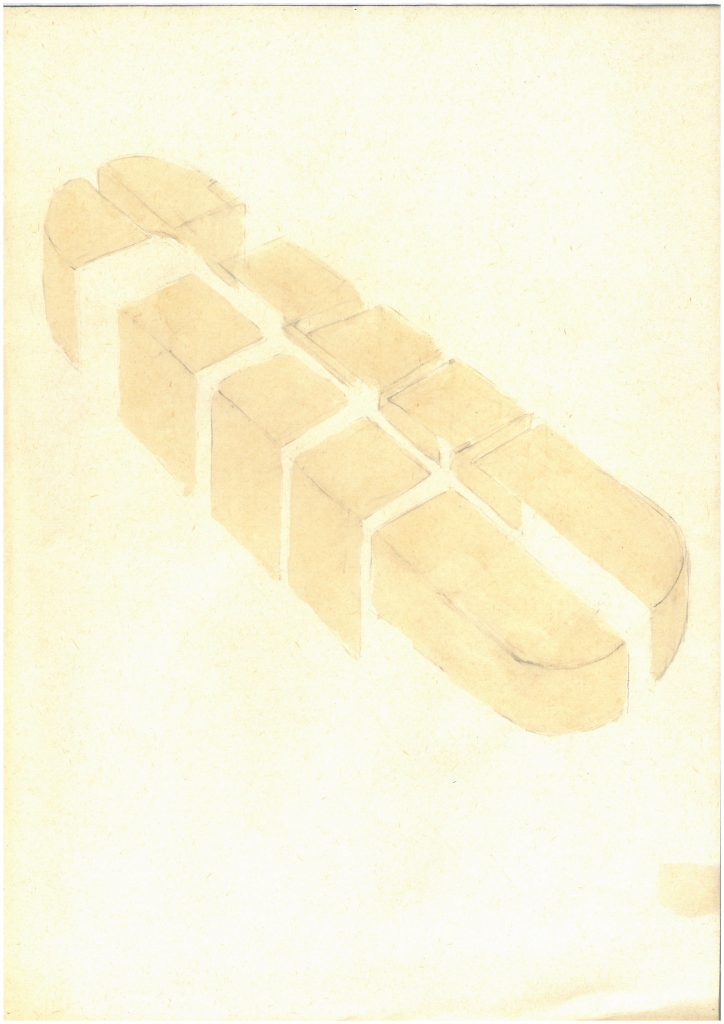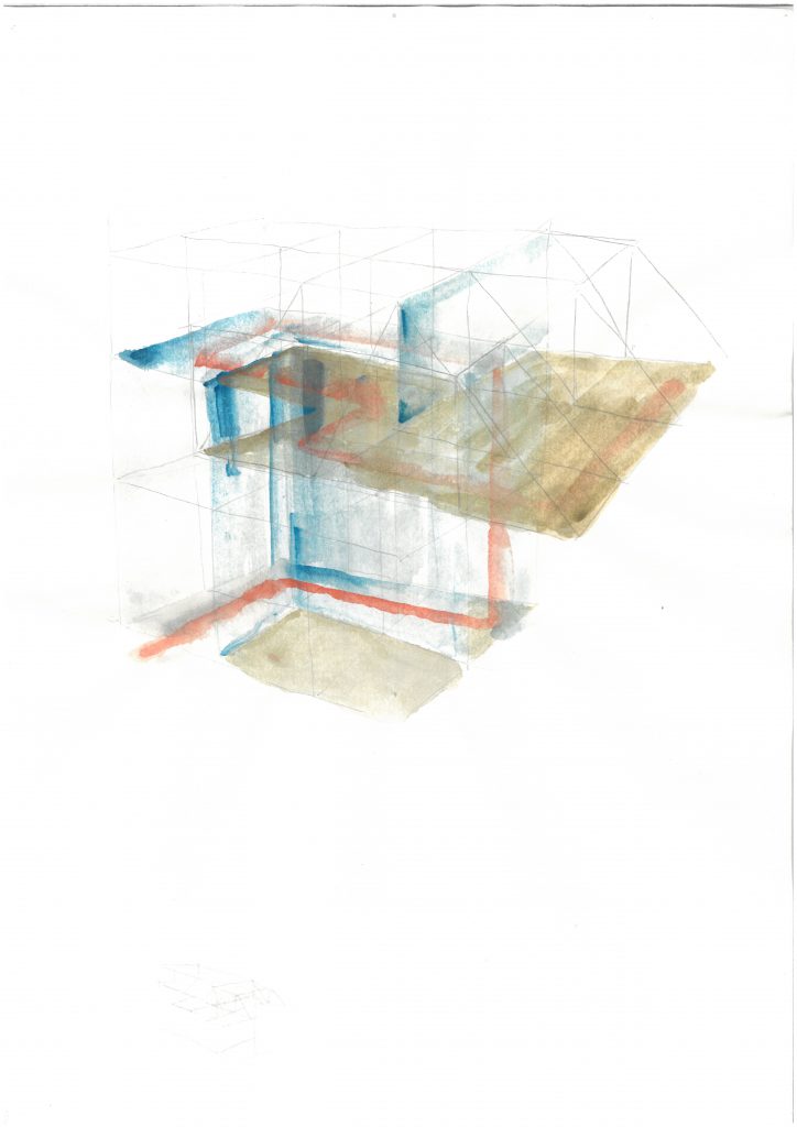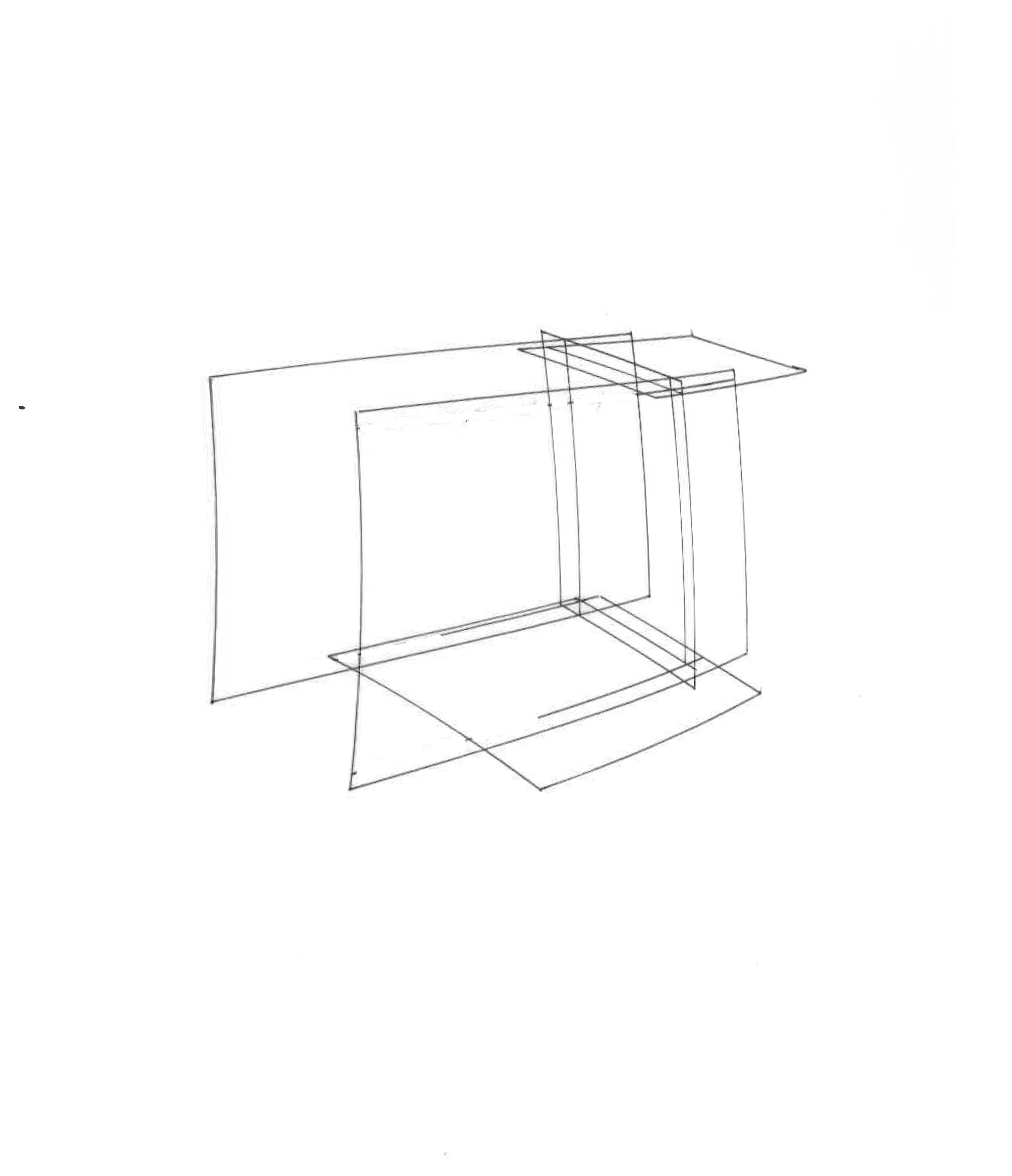 ⇧ Einer von 5 Entwürfen unterschiedlicher räumlicher Zusammenhänge, Spurpunkt-Fluchtpunktdarstellung, nachbearbeitet, 2010